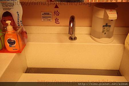 旁邊是洗手台... 自動感應式的水龍頭+給皂器+乾洗手(?)